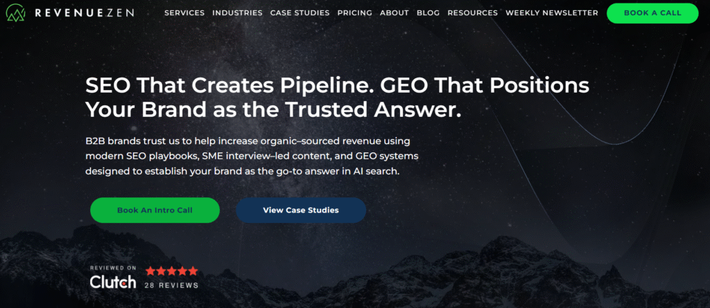 RevenueZen is a GEO-focused B2B SEO agency built for pipeline-first growth. They focus on GEO, SEO, and content that connects directly to revenue.